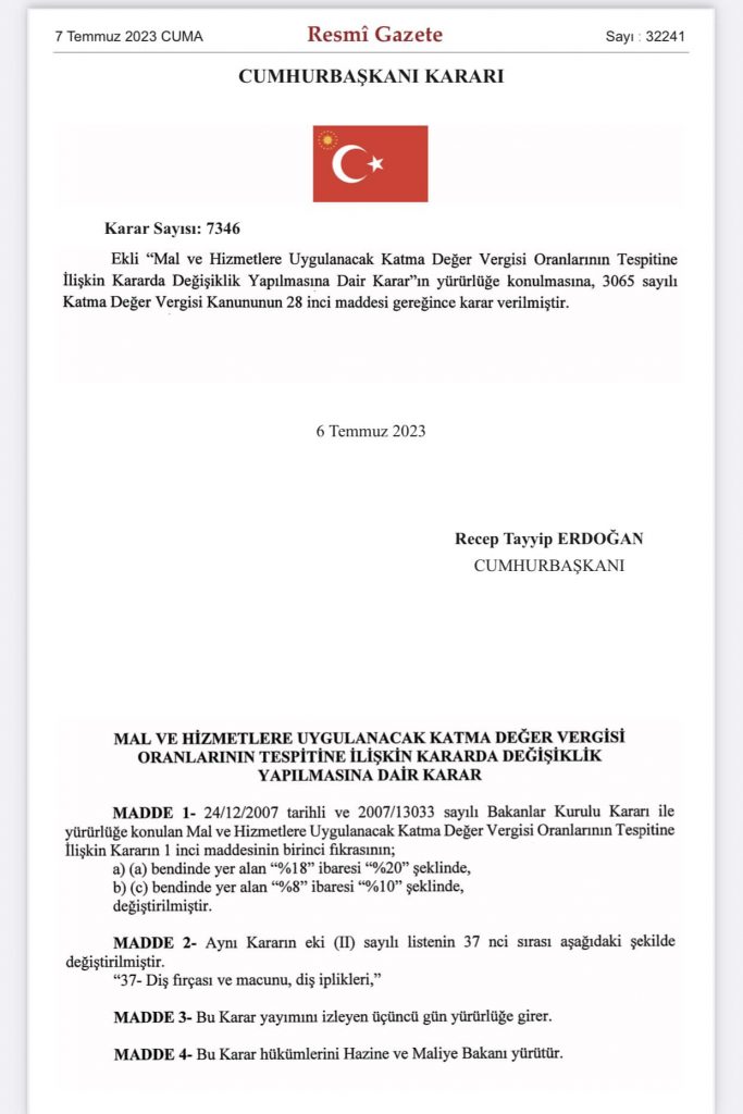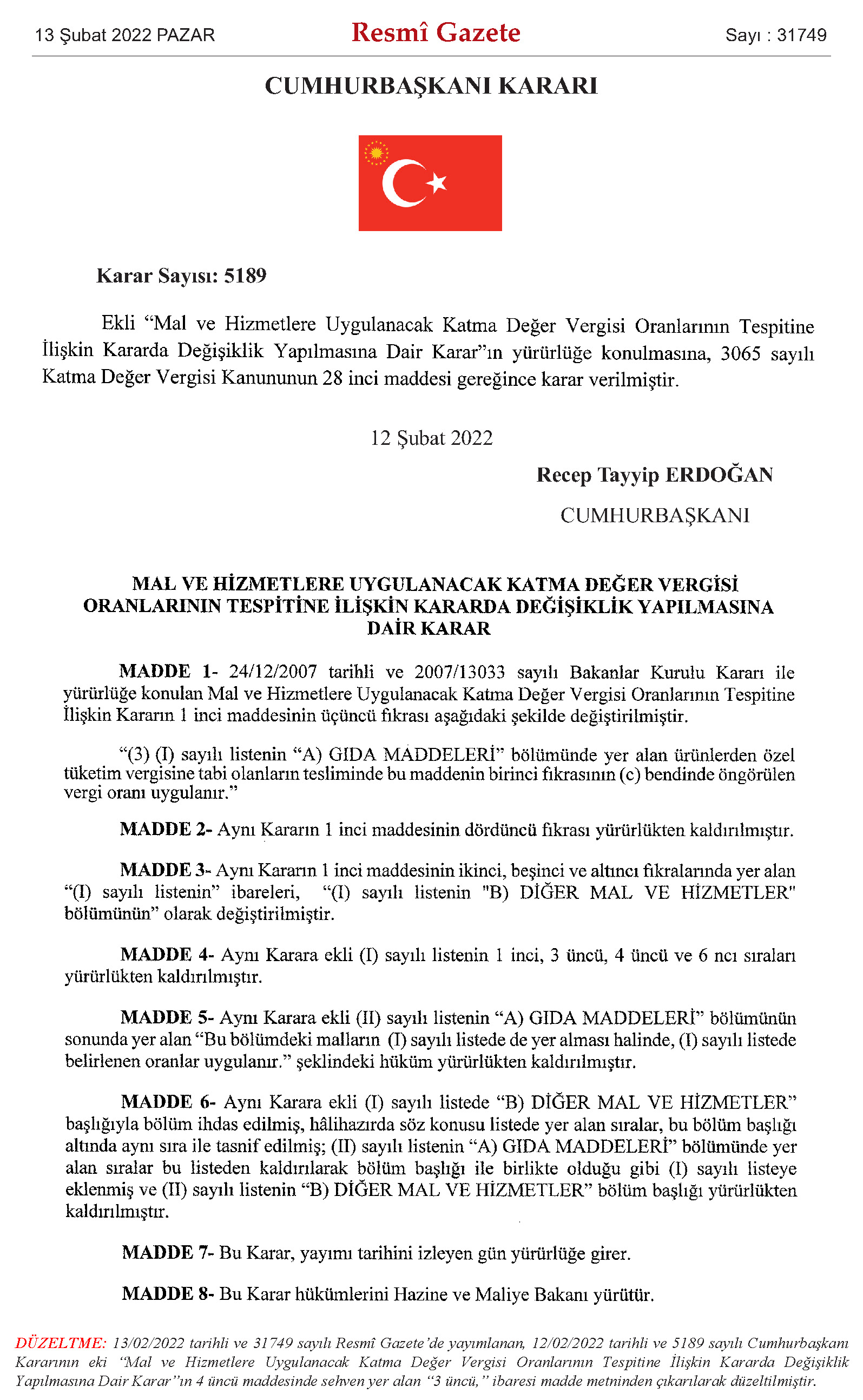 Resmi Gazete’de yayımlanan Cumhurbaşkanı Kararı’na göre; Mal ve Hizmetlere Uygulanacak Katma Değer Vergisi Oranlarının Tespitine İlişkin Kararın