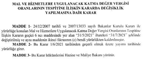 Mal ve hizmetlere uygulanacak katma değer vergisi oranlarının tespitine ilişkin kararda değişiklik yapılmasına dair karar alınmış (2812) ve Resmi Gazetede yayımlanmıştır. Bu kararla 24.12.2007 tarihli ve 2007/13033 sayılı Bakanlar Kurulu Kararı ile yürürlüğe konulan Mal ve Hizmetlere Uygulanacak KDV oranlarının tespitine ilişkin karara, geçici 5. maddesinden sonra gelmek üzere ekteki geçici 6. Madde eklenmiştir. Geçici 6. Madde 31/12/2020 tarihine kadar (bu tarih dâhil) geçerlidir. (Bu maddelere yazının sonunda ulaşabilirsiniz.)