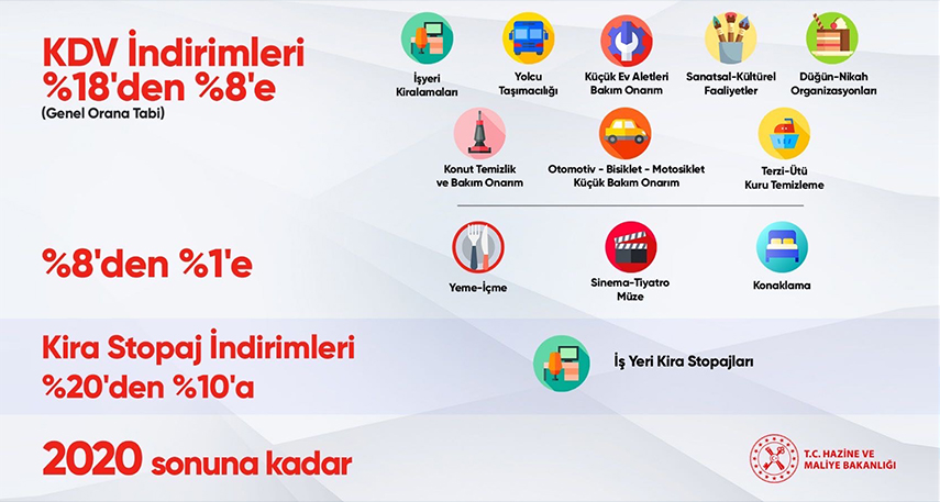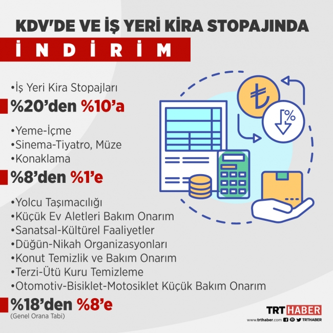 Salgın döneminde en çok etkilenen sektörlerden turizm ile doğrudan ve dolaylı ilgili olan konaklama hizmeti, yeme-içme sektöründe verilen hizmetler ile sinema, tiyatro, opera, operet, bale ve müze giriş ücreti gibi kültürel faaliyetlerin yüzde 8 olan KDV oranları yıl sonuna kadar geçici olarak yüzde 1’e indirildi.
