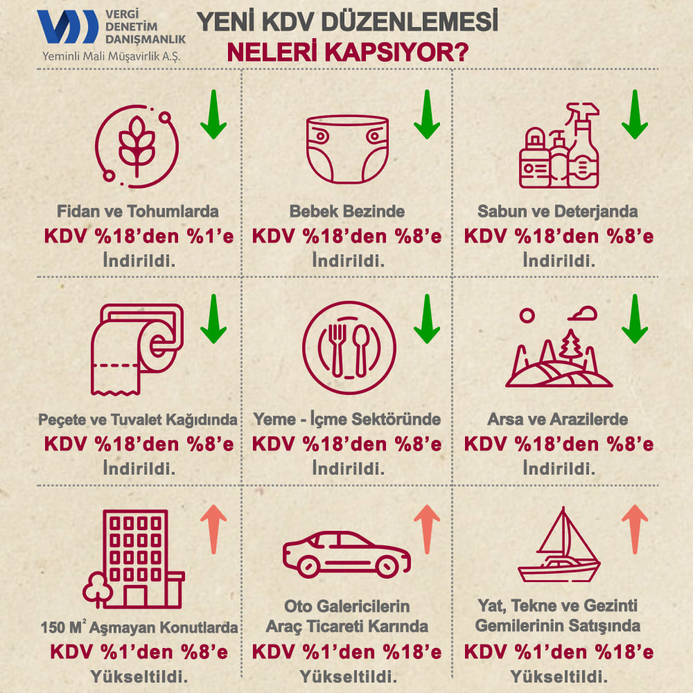 Pandeminin ekonomiyi olumsuz etkilemesinin ardından Cumhurbaşkanlığı kararı ile KDV indirimine gidilmişti. Çok sayıda hizmette KDV indirimi yapılırken Resmi Gazete’de yayımlanan karara göre KDV indirimi 31 Mayıs 2021 tarihine kadar uzatılmıştı. 23.12.2020 tarihinde Resmi Gazetede yayınlanan 3318 sayılı Cumhurbaşkanlığı kararı ile konaklama, yeme-içme, sinema-tiyatro-müze hizmetleri için KDV oranı 01.06.2021 tarihine kadar %1 olarak belirlenmiş ve 01.06.2021 tarihi itibariyle tekrar %8’e çıkartılması kararlaştırılmıştı.